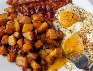 2 eggs cooked to order, 2 strips of applewood smoked bacon, red skillet potatoes, and Texas toast